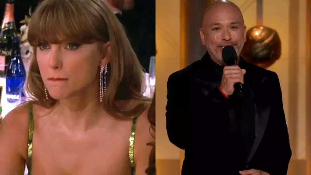 Jo Koy, the host of the Golden Globes, addresses Taylor’s intense reaction to his joke with a piercing gaze.