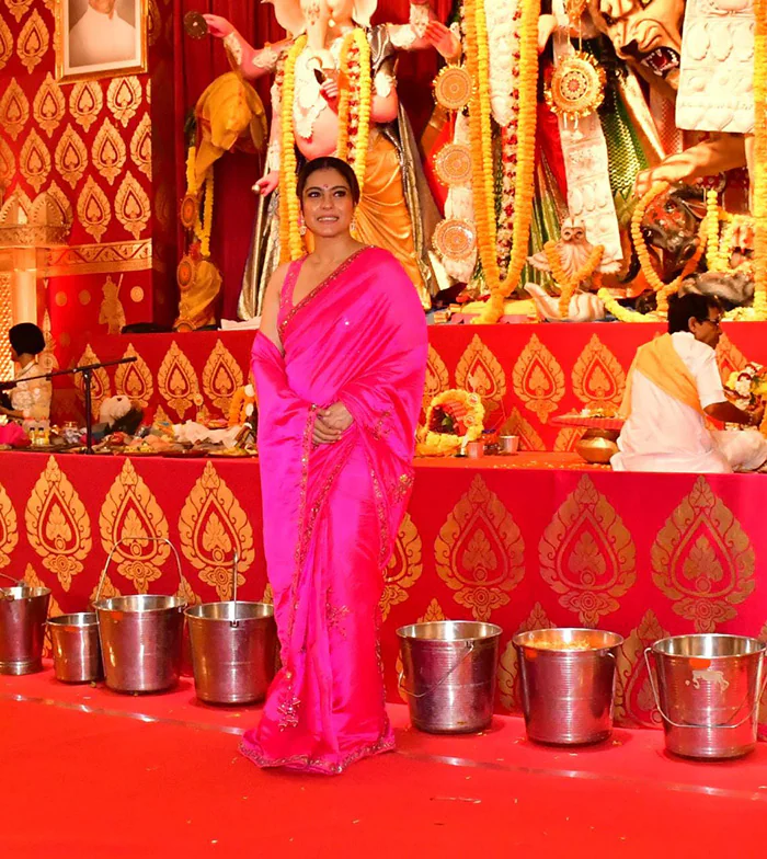 Kajol made a stylish appearance at the North Bombay Sarbojanin’s Durga Puja pandal on Maha Saptami. She looked stunning in a deep pink saree, complemented by flowers in her hair and jhumkas. Accompanied by her son Yug, who was dressed in a white kurta, they were photographed together as they entered the pandal. Prior to this, Kajol and Yug attended a special screening of Ganapath together a few days ago.