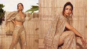Malaika Arora recently posed as a model for the fashion brand Frontier Raas, showcasing their Amber Gold outfit from the Songs Of Heaven collection. The three-piece ensemble featured a bralette-style top with ornate details and a cape-like jacket. The attention-grabbing trousers, with sheer panels and extensive sequin embroidery, added a touch of glamour to the overall look. The outfit successfully combined contemporary elements with traditional influences, creating a refined and sophisticated style.
